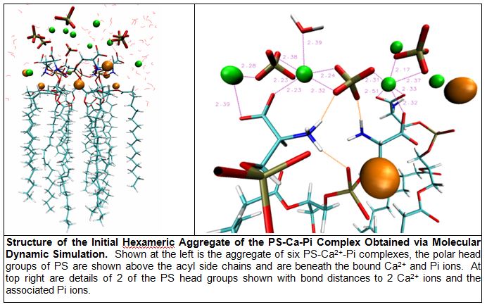 Computational chemistry and molecular dynamic simulations (MDS), modeled after osteoarthritic and calcified aortic valve matrix vesicles, are used to simulate the formation, regulation and reaction products of amorphous calcium phosphate (ACP), annexin-5 (Anx-5) protein and phospholipid- Ca∙Pi∙ complexes involved in the calcification process. These nanoscale biomimetic mineralization structural models will improve understanding of the mechanism of arthritic joint and aortic valve calcification and be used to create novel therapies for preventing these diseases by enabling visualization of novel target sites of within the calcification complexes previously not discernable by other experimental methods.